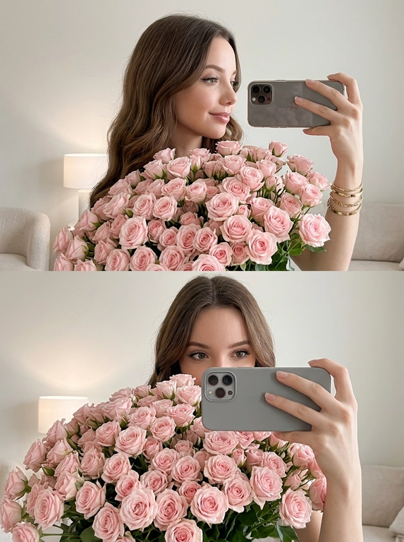 ИИ сделает коллаж из двух селфи в зеркале: вы в светлой минималистичной комнате, с аккуратным макияжем и огромным букетом нежно‑розовых кустовых роз. В одном кадре вы улыбаетесь боком, в другом — почти прячетесь за цветами и выглядываете. Загрузите одно фото.
