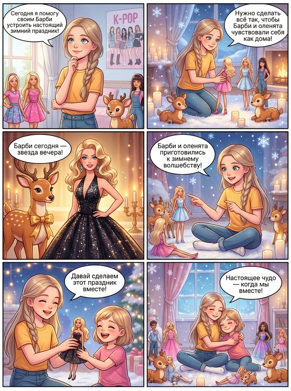 Создайте комикс на 4–8 кадров, где ваш ребенок — главный герой уникальной истории. Введите имя, пол, возраст и увлечения ребенка, чтобы получить персонализированный сюжет и яркие иллюстрации. Отличный подарок и веселое воспоминание для всей семьи.