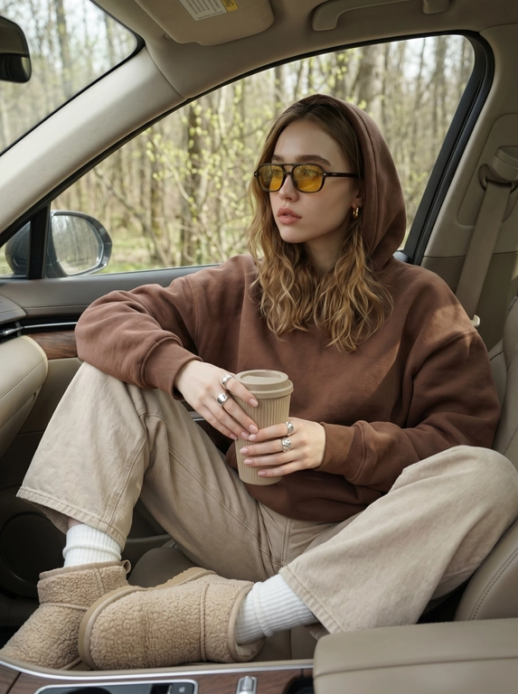 Нейросеть сделает фотореалистичное editorial‑фото в уютном салоне автомобиля: вы сидите полубоком в оверсайз худи и держите кофейную чашку. Спокойный взгляд вдаль, мягкий дневной свет, за окном приглушённые весенние тона и минималистичная атмосфера. Можно выбрать цвет худи, чашку и очки.