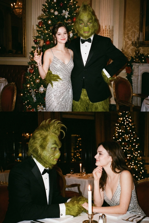 ИИ-сервис создаст две фотографии: на первой — вы и Гринч в смокинге у новогодней елки в ретро-ресторане, на второй — романтический ужин за столиком. Стиль — 90-е, пленочная зернистость. Просто загрузите свое фото, других полей заполнять не нужно.