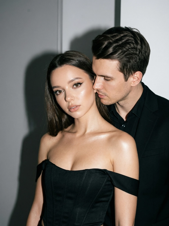 ИИ сделает студийный крупный портрет пары в чёрном: вы в кадре близко, женщина впереди, мужчина позади, лёгкое касание у плеча и прямой взгляд в камеру. Получится гламурный fashion-стиль с выразительными тенями и холодной нейтральной палитрой. Загрузите 1–2 фото.