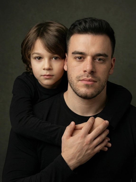 ИИ создаст реалистичный студийный портрет отца и сына: кадр крупный, лица рядом, сын обнимает отца сзади. Спокойные эмоции, нейтральный тёмный фон и мягкий свет. Одежда — простые чёрные свитера или лонгсливы. Введите фото отца и сына для создания снимка.