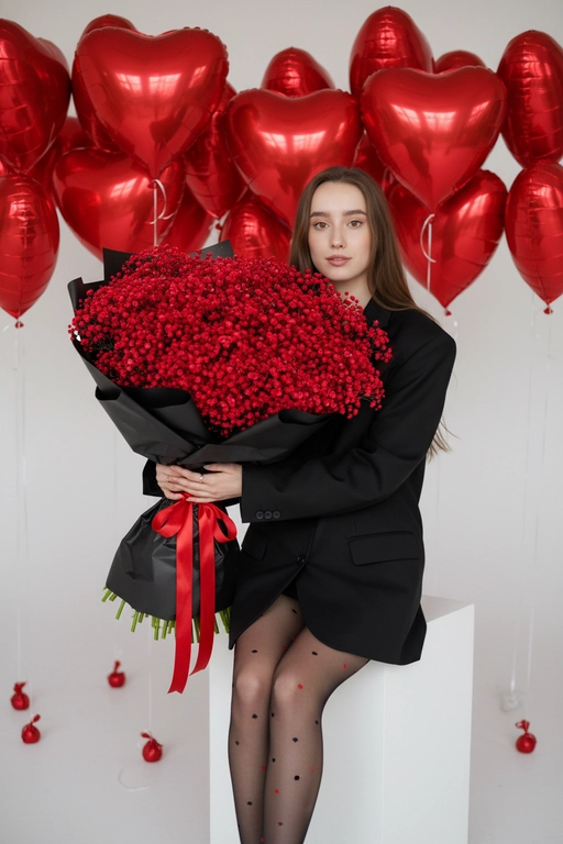 Создайте модный портрет с пышным букетом и красными шарами-сердцами в стиле Vogue.