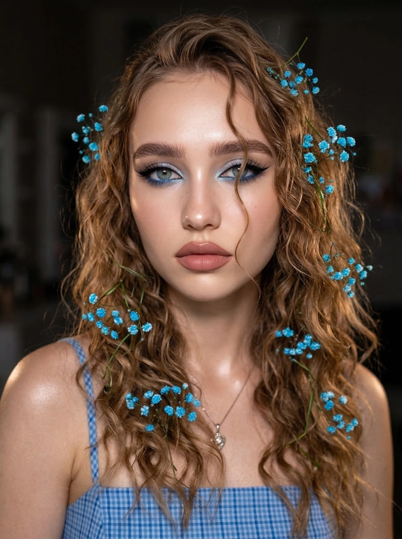 Нейросеть сделает гиперреалистичный fashion-портрет крупным планом: объёмные волосы с нежно‑голубыми цветами (как гипсофила), аккуратный голубой макияж со стрелками и мягкий студийный свет. Настроение — романтичная весна, естественная кожа и выразительный взгляд. Выберите в поле «Какая будет прическа?» подходящий вариант.