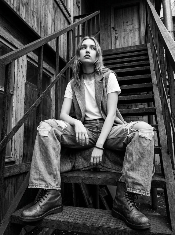 Нейросеть сделает чёрно-белый гранж-портрет: вы сидите на металлической лестнице у старого здания, вокруг деревянные стены и индустриальные детали. Настроение мрачное и бунтарское, как в уличной фотосессии. Поза расслабленная, взгляд вверх, грубые ботинки и рваные джинсы.
