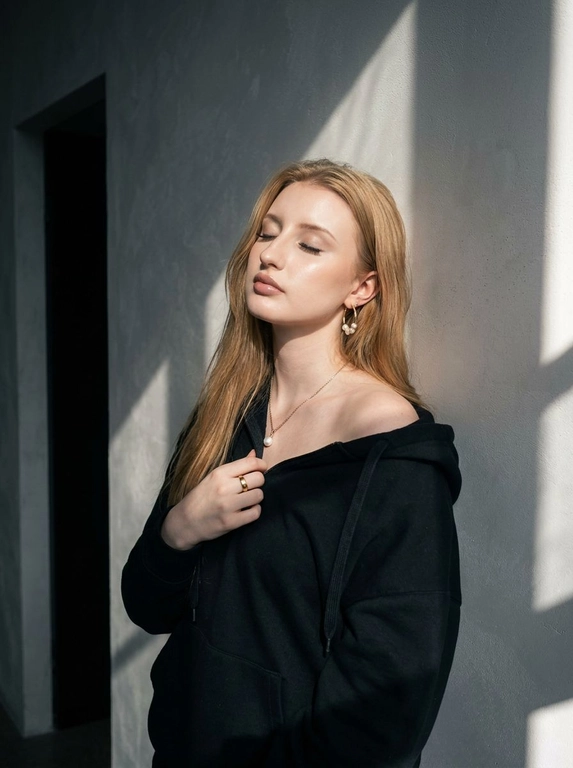 ИИ создаст реалистичный портрет женщины у серой текстурированной стены: закрытые глаза, лицо в солнечном свете с выразительными тенями. На ней оверсайз толстовка с капюшоном, минималистичный интерьер и натуральный макияж. Укажите цвет толстовки для результата.
