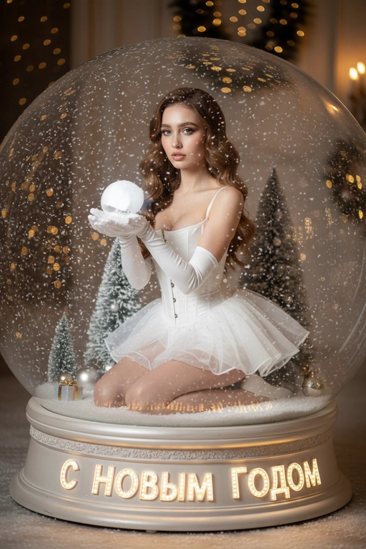 ИИ создаёт портрет женщины, позирующей внутри гигантского снежного шара. Вокруг — искусственный снег, рождественский декор и надпись «С Новым Годом». Необходимо выбрать одежду для образа: корсет, платье-комбинацию или костюм. Фото получается праздничным и атмосферным.