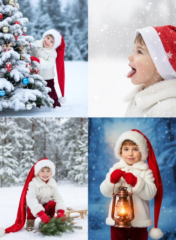 Сделайте 12 праздничных фото вашего ребёнка в зимнем лесу — в белом пальто с мехом, длинной красной шапке Санты и варежках. Атмосфера сказки, снежный лес, украшенные ёлки, санки, игрушки. Нейросеть сохранит черты лица с вашего фото.