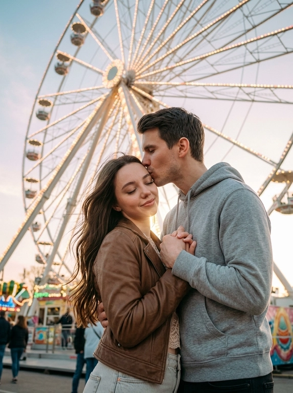 Нейросеть сделает нежный романтический кадр: вы с партнёром обнимаетесь и целуетесь в весеннем парке аттракционов, а за спиной — большое колесо обозрения. Тёплый золотой свет и мягкое боке создают уютную love story. Нужно загрузить 1–2 фото.