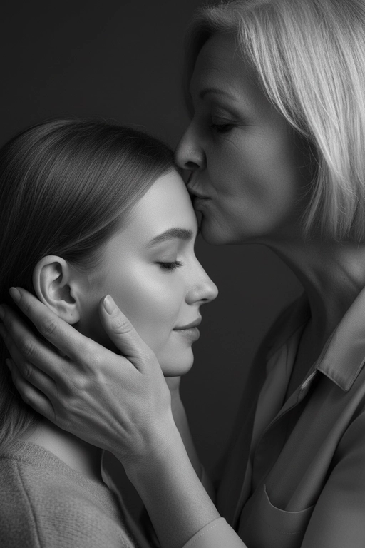 Создайте чёрно-белый крупный портрет матери и ребёнка, где мама нежно целует сына или дочку в лоб. Реалистичная студийная съёмка, мягкий свет, чёткие черты лиц. Идеально подходит для семейных фото без лишних деталей.