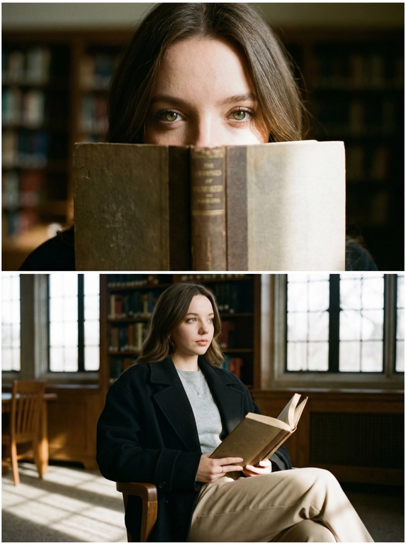 Нейросеть сделает вертикальный коллаж из 2 кадров в винтажной библиотеке с чистым светом и эстетикой Poetcore. Вверху — крупный план: книга закрывает нижнюю часть лица, видны только глаза. Внизу — вы сидите с открытой книгой и смотрите в сторону.