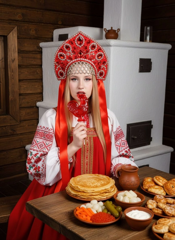 ИИ создаст фото в русском народном образе Масленицы: девушка в роскошном красном кокошнике с камнями и лентами, в красно-белом платье с орнаментом. На фото — традиционный интерьер, блины на столе, праздничная атмосфера.