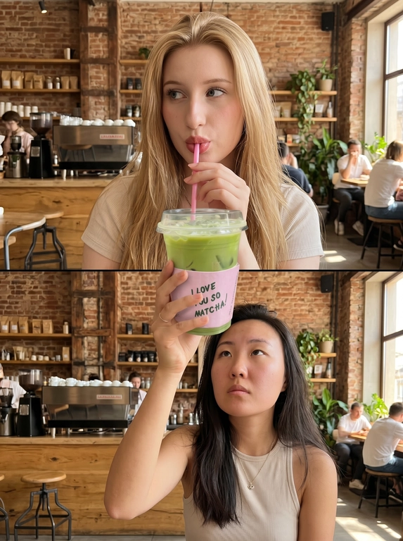 Создайте ИИ-фото «Матча-латте коллаж» из 2 кадров