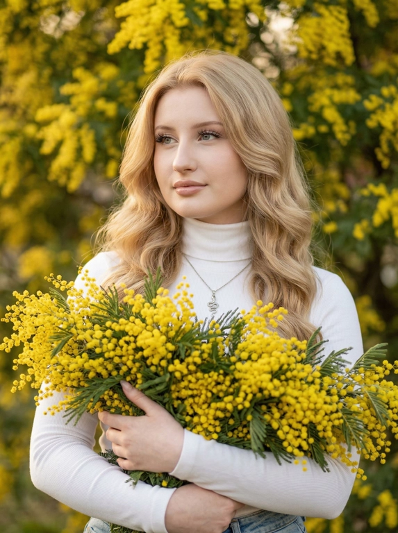 Портрет крупным планом: женщина держит у груди пышный, свежий букет мимозы на фоне цветущего дерева. Видно только по пояс, макияж — нюдовый, легкий румянец. Фигура подчеркнута белой водолазкой.