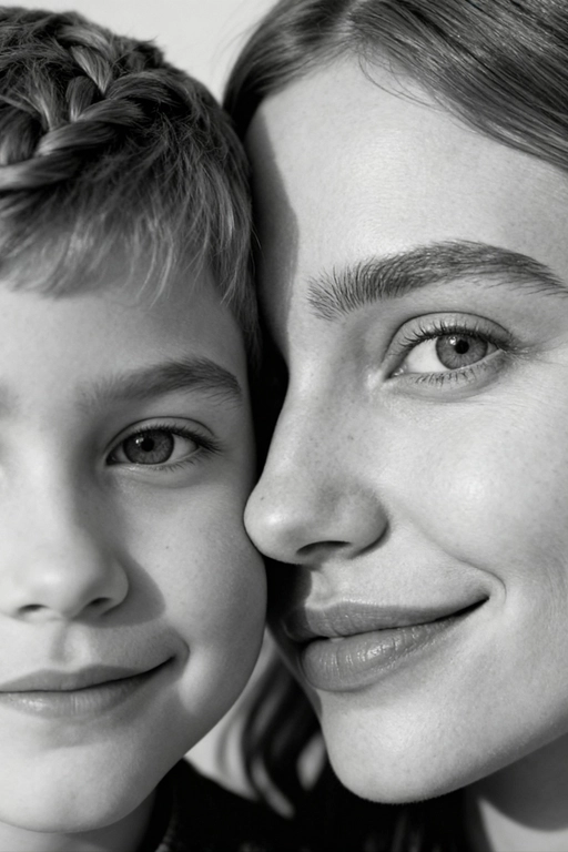 Создайте художественный черно-белый портрет матери и ребенка в студийном стиле. Снимок крупным планом, лица рядом, выражают нежность и близость. Детализация кожи, мягкое освещение и белый фон. Для результата загрузите совместное фото мамы и ребенка.