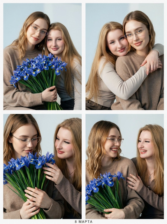 Нейросеть соберёт фотобудку 2×2: четыре фотореалистичных кадра крупным планом с двумя женщинами (например, мама и дочь). В каждом кадре — новая поза и эмоция, но лица остаются теми же, как на ваших фото. Можно выбрать, какие цветы будут в руках: ирисы или тюльпаны.