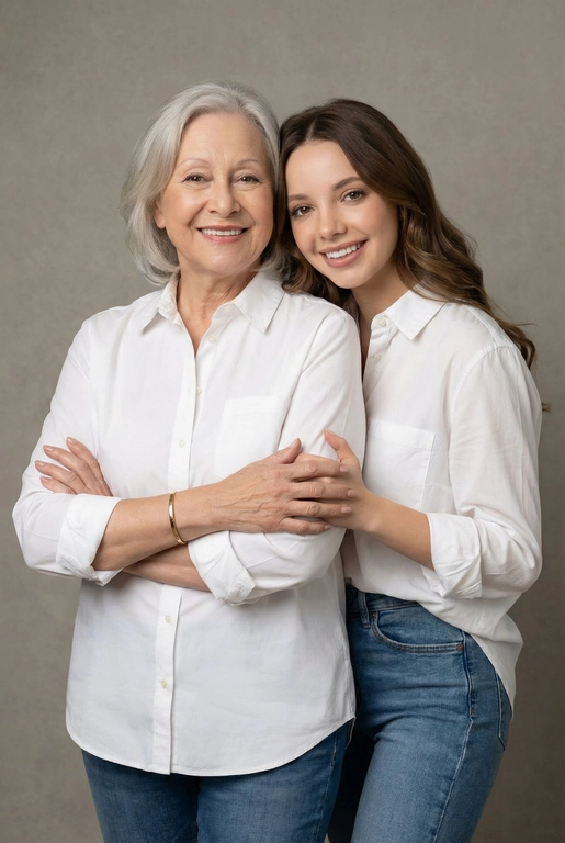 Стильный студийный портрет мамы и дочери с мягким светом и нейтральным фоном. Минималистичный современный образ подчеркнёт естественную красоту и близость. Загрузите фото и выберите стиль одежды — например, белые рубашки или бежевые свитера. Получите элегантную семейную фотографию.