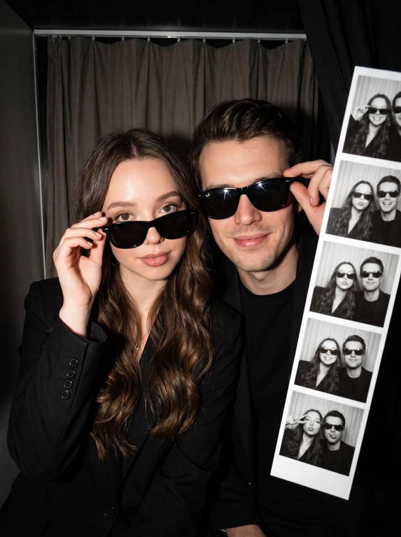 ИИ сделает фото, будто вы вдвоём сидите в тесной винтажной фотокабине: total black, эстетика old money и secret agent. Жёсткая вспышка подчёркивает лица и детали, а на переднем плане — лента чёрно-белых снимков с вами. Нужно загрузить 1–2 фото пары.