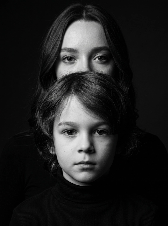 Черно-белый портрет «дуэт поколений»: ребенок на переднем плане смотрит прямо в камеру, а родитель стоит позади — видны только глаза и лоб, остальное скрывает голова ребенка. Темный фон, мягкий студийный свет, реалистичная кожа и сохранение черт лица. Загрузите 1–2 фото.