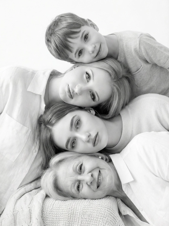 ИИ создаёт чёрно-белый семейный портрет матери и детей, снятый сверху. Все головы выстроены в вертикальную линию, расположены по возрасту, выражения лица – мягкие и спокойные. Видны только головы и плечи, фон чистый и светлый.