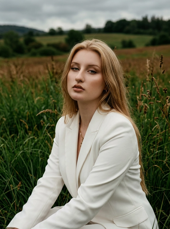 ИИ сделает кинематографичный fashion‑портрет в высокой траве: пасмурное небо, мягкий свет и тень, взгляд прямо в камеру. Белый объемный жакет, естественный коричневый макияж, волосы развеваются на ветру. Стиль Vogue и old money. Поля для заполнения: не нужны.