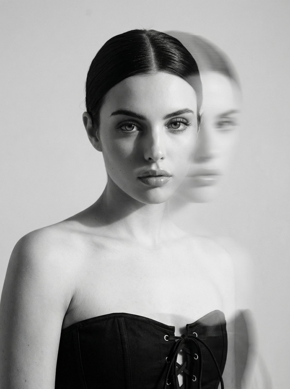 Нейросеть сделает чёрно-белый студийный портрет с мягкими солнечными бликами и эффектом «следа движения». Рядом с чётким лицом появится полупрозрачный размытый силуэт, как будто вы повернули голову в кадре. Добавится лёгкое плёночное зерно и арт-настроение. Выберите причёску: пучок, хвост или оставить свою.