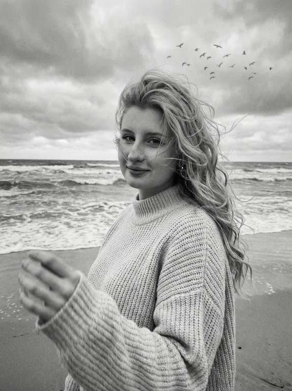 ИИ превращает ваше фото в черно-белую ретро фотографию на морском побережье: человек в светлом вязаном свитере стоит у моря, легкая улыбка, зернистость пленки, винтажная атмосфера. На фоне — волны, стая птиц, пасмурное небо, размытие в движении.