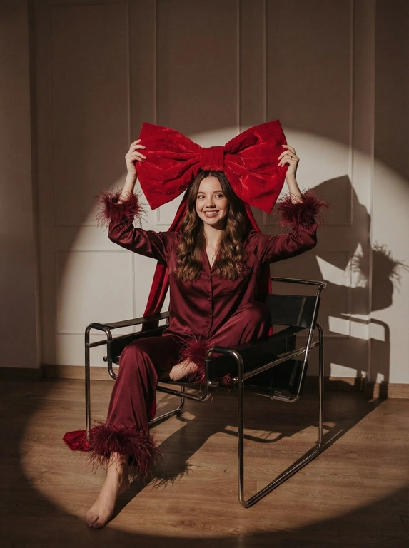 Стильная фотосессия в студии с красным бархатным бантом — главный акцент на вас. Получится фэшн-портрет: драматичный свет, атмосфера новогоднего гламура и ощущение, что вы сами — праздничный подарок. Заполните поле «Какой будет наряд?» для идеального результата.