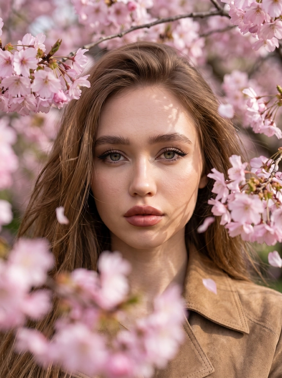 Нейросеть сделает крупный портрет через ветви цветущей сакуры: резкий фокус на глазах, мягкое розовое боке на переднем плане, живой взгляд. Естественный свет рисует на лице тонкий узор теней, а кожа выглядит детально, как в журнальной съёмке. Нужно только ваше фото.