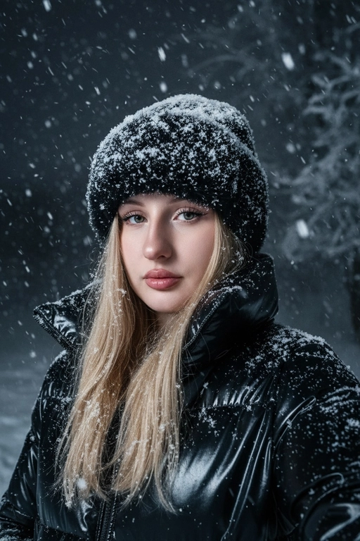 ИИ создаёт атмосферное зимнее селфи в заснежённом лесу ночью. На фото крупным планом женский портрет в пуховой куртке и меховой шапке, покрытых снегом. Видны выразительные глаза, снежинки на ресницах и волосах. Укажите цвет шапки и куртки.