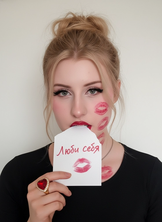 ИИ создаст фотореалистичный Y2K-портрет крупным планом с драматичным верхним светом. На лице и шее — следы поцелуев с красной помадой. Модель кусает разорванный лист с надписью помадой «день самовлюблённых». Заполните поле «Какая будет подпись?»