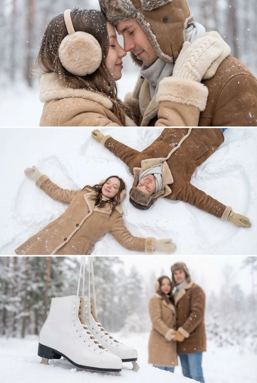 Создайте фотоколлаж из трёх зимних кадров: вы и ваша вторая половинка гуляете по заснеженному лесу, вместе делаете снежных ангелов, делитесь уютными моментами. Реалистичная и тёплая атмосфера, мягкий свет, детали зимней одежды. Загрузите фото вдвоём для создания результата.