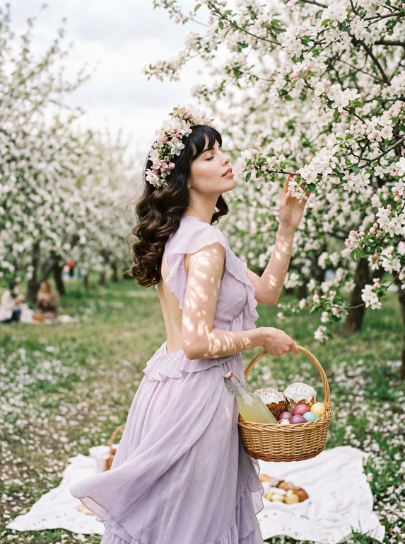 Нейросеть сделает нежный кинематографичный портрет в цветущем весеннем саду: венок из живых цветов, мягкий свет, лепестки и уютный пасхальный пикник с куличами и яйцами. Выберите цвет платья (лиловый, жёлтый, розовый или свой вариант) — внешность на фото сохранится.