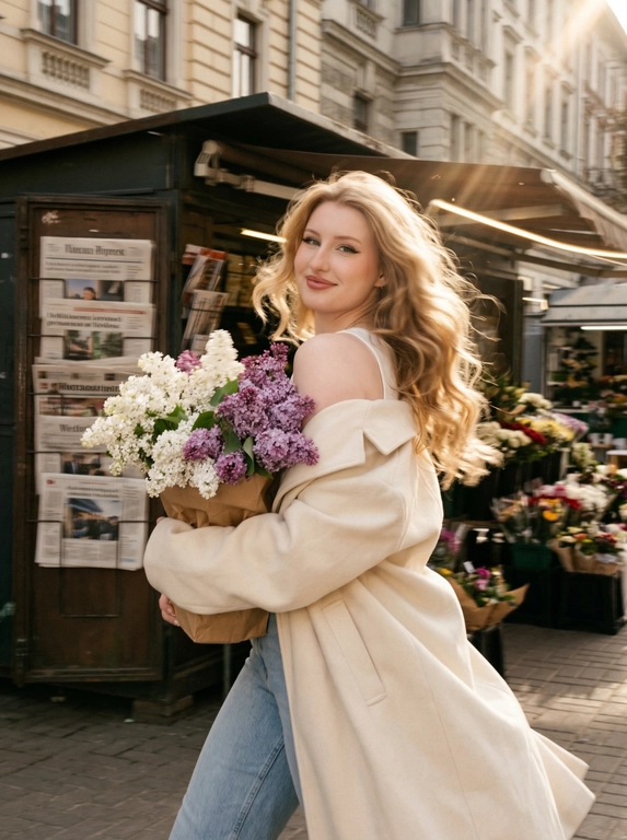 Нейросеть сделает фотореалистичный уличный кадр весеннего дня: вы идёте по городу в кремовом оверсайз-пальто и джинсах, в руке — белый бумажный пакет с пышной сиренью. Тёплый солнечный свет, лёгкая динамика и романтичное настроение. Поля заполнять не нужно.