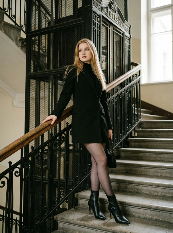 Нейросеть сделает кинематографический портрет девушки на лестнице: вы опираетесь на деревянный поручень и чёрные кованые перила, а на фоне виден ретро-лифт и каменный пол старого дома. Образ — чёрное платье-пиджак, каблуки, сумочка, взгляд в сторону. Загрузите одно фото.