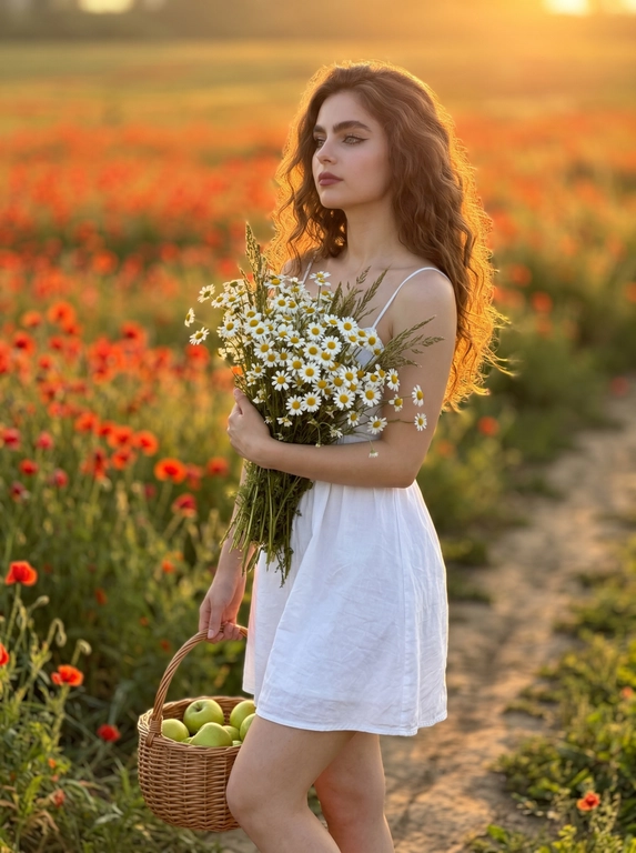 Нейросеть сделает тёплый лайфстайл-кадр на закате: вы на загородной дороге среди маковых полей, с большим букетом ромашек в руках. Лёгкий ветер шевелит платье, свет мягкий и золотой, настроение спокойное и мечтательное. Выберите цвет платья.