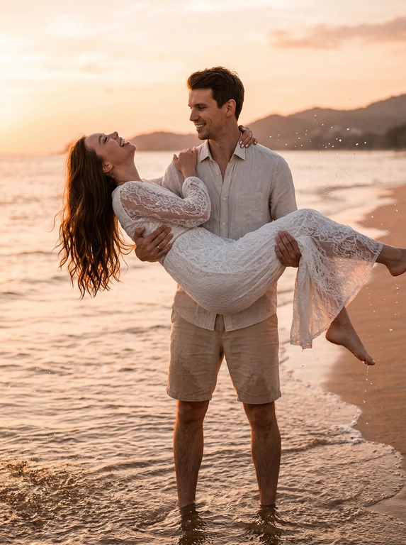Нейросеть создаст фотореалистичное фото «Любовь на закате»: морской берег в золотой час, мягкий тёплый свет, нежная атмосфера. Мужчина стоит в воде и держит женщину на руках, она откидывается назад и улыбается, вокруг летят брызги. Загрузите 1–2 фото пары.
