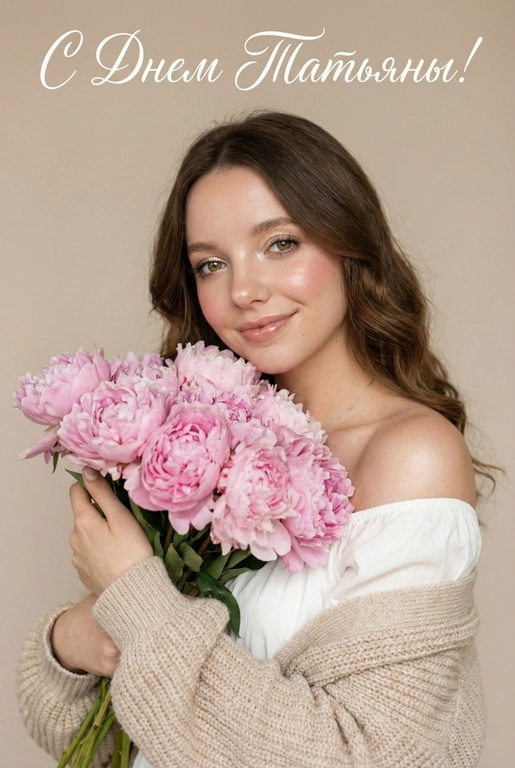 Создайте праздничную открытку на Татьянин день с красивым букетом пионов. Выберите подпись для открытки — например, «С Днем Татьяны!» или придумайте свою. Получите стильное изображение для поздравления студентки, подруги или коллеги.