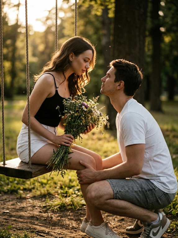 Нейросеть сделает киношный кадр «Качели для двоих»: вы в парке на качелях, тёплый свет золотого часа, живой взгляд в глаза и лёгкое плёночное настроение. Девушка с букетом полевых цветов, парень рядом — романтика без лишней постановки.