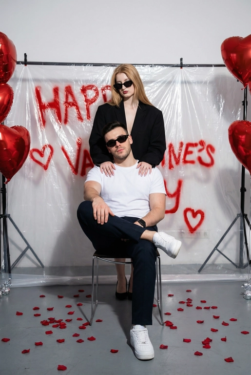 Современная фотосессия для пары ко Дню святого Валентина: съёмка в белой студии с прозрачной плёнкой и красными граффити. Атмосфера fashion и арт-хаоса, акцент на эмоциях и стиле. Нужно загрузить совместное фото или два отдельных снимка пары.