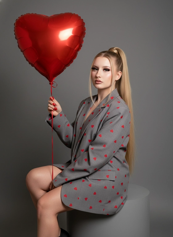 ИИ сгенерирует стильное фото в духе Vogue: женщина в сером oversize пиджаке с мелкими красными сердечками, сидит на круглом пьедестале с гелиевым шаром-сердцем в руке. Выберите прическу, чтобы получить индивидуальный модный образ ко Дню Святого Валентина.