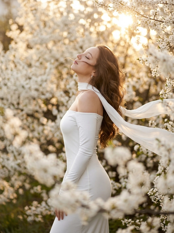 Нейросеть сделает фото, где женщина в длинном белом платье стоит в профиль среди густых белых цветущих ветвей. Голова запрокинута к свету, глаза закрыты, вокруг мягкое боке и тёплое солнце золотого часа. На шее — тонкий белый шарф-лента, развевающийся на ветру.