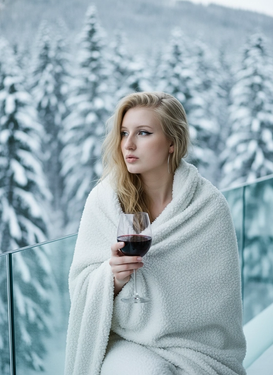 ИИ создаст реалистичный fashion-портрет женщины на современном балконе зимой. Вас ждёт уютная атмосфера с пушистым одеялом, красным вином и видом на заснеженный лес. Фото с естественным светом, акцентом на лице и деталях. Нужно загрузить вашу фотографию.