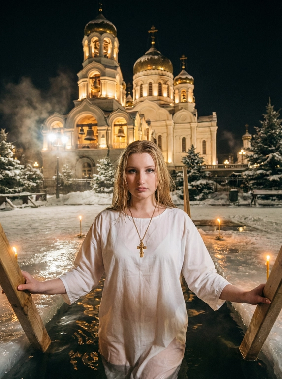 ИИ создаёт фотореалистичное изображение зимнего крещения в проруби возле освещённого храма ночью. На фото — человек в соответствующей одежде заходит в купель, на фоне — храм с подсветкой и колоколами. Нужно загрузить своё фото для генерации.
